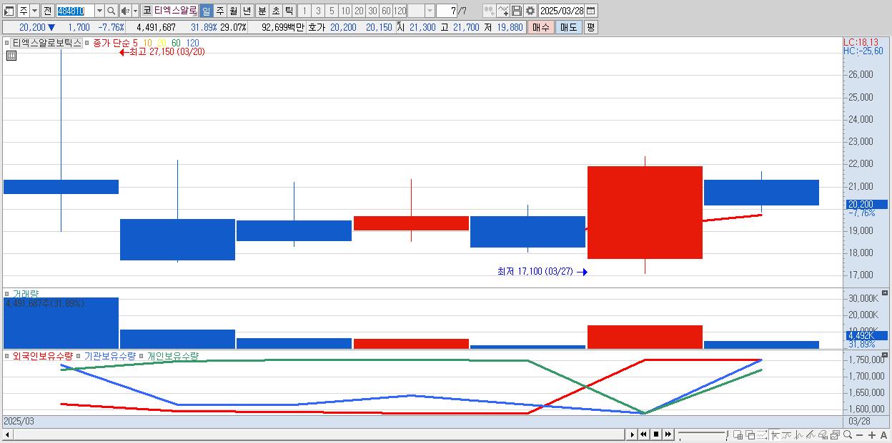 - 티엑스알로보틱스 (20,200원 ▼ -7.76% , 시총: 3,121억, 거래량: 4,491,687, 거래대금:927억)