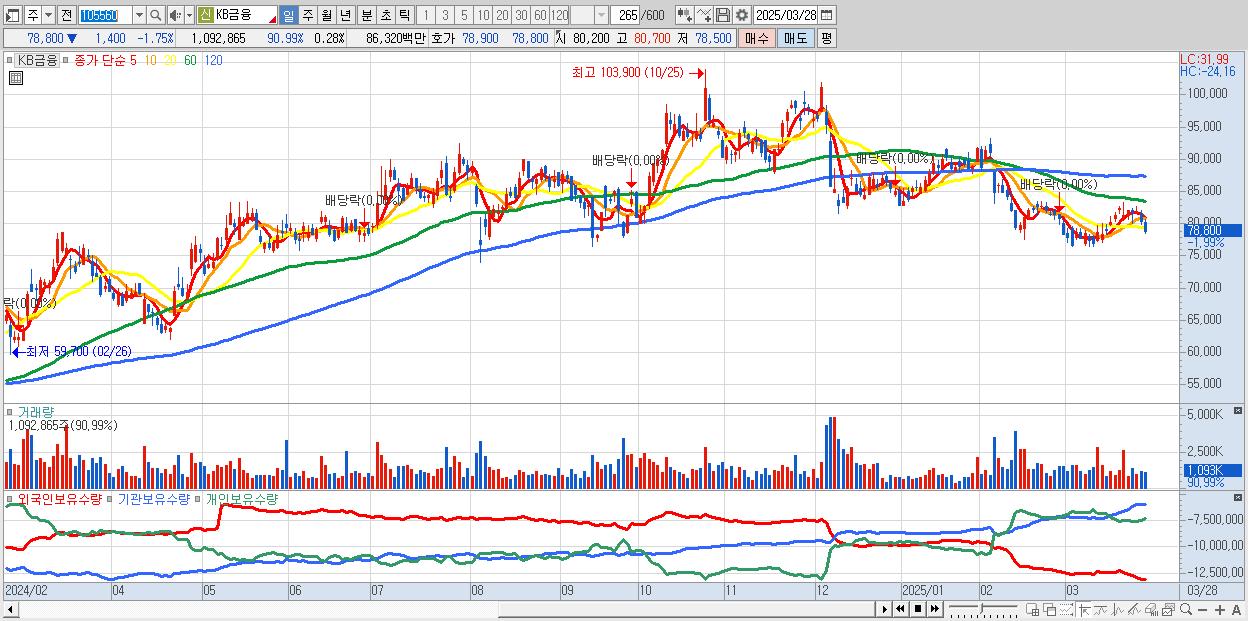 - KB금융 (78,700원 ▼ -1.87% , 시총: 309,707억, 거래량: 1,041,894, 거래대금:823억)