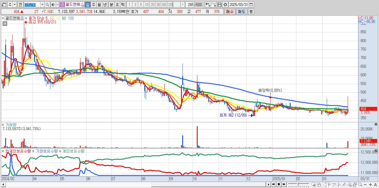 - 골드앤에스 (404원 ▲ 7.16% , 시총: 193억, 거래량: 7,133,597, 거래대금:32억)
