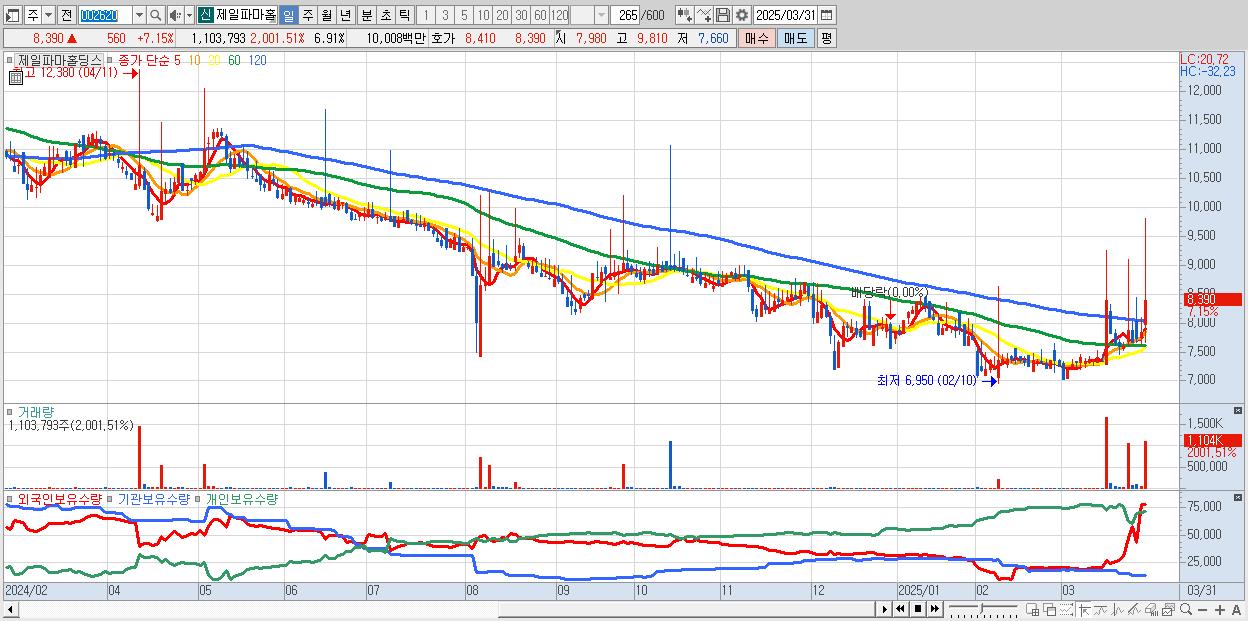 - 제일파마홀딩스 (8,390원 ▲ 7.15% , 시총: 1,340억, 거래량: 1,103,793, 거래대금:100억)