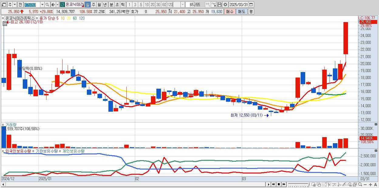 - 온코닉테라퓨틱스 (25,950원 ▲ 29.88% , 시총: 2,824억, 거래량: 9,635,417, 거래대금:2,200억)
