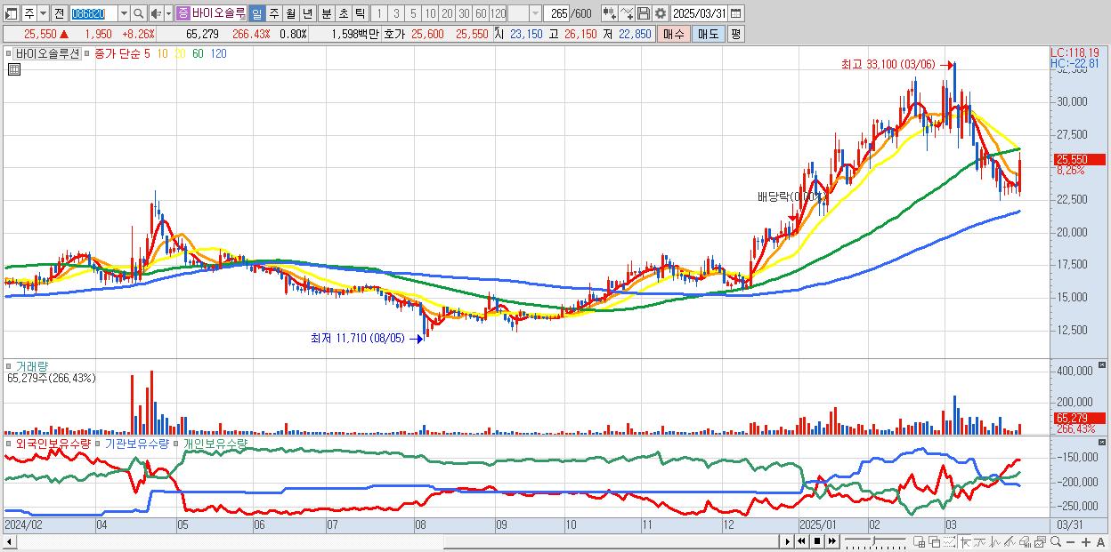 - 바이오솔루션 (25,550원 ▲ 8.26% , 시총: 2,086억, 거래량: 65,279, 거래대금:16억)