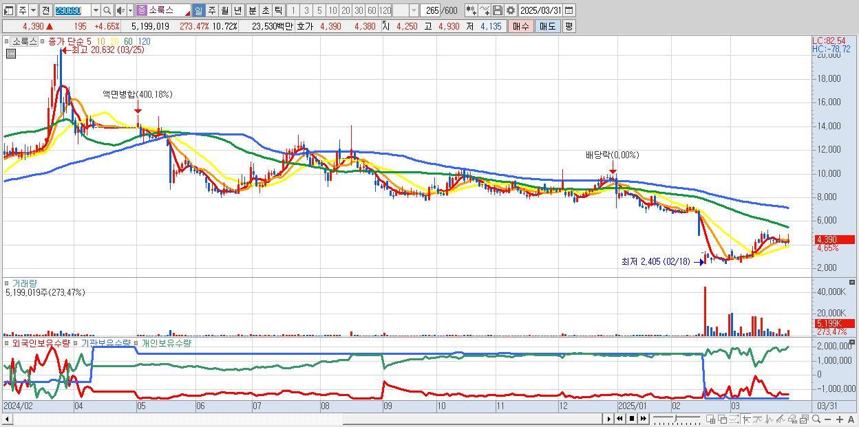 - 소룩스 (4,500원 ▲ 7.27% , 시총: 2,182억, 거래량: 2,826,080, 거래대금:127억)