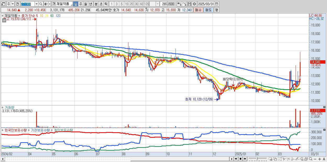 - 제일약품 (14,640원 ▲ 18.45% , 시총: 2,153억, 거래량: 3,131,178, 거래대금:456억)