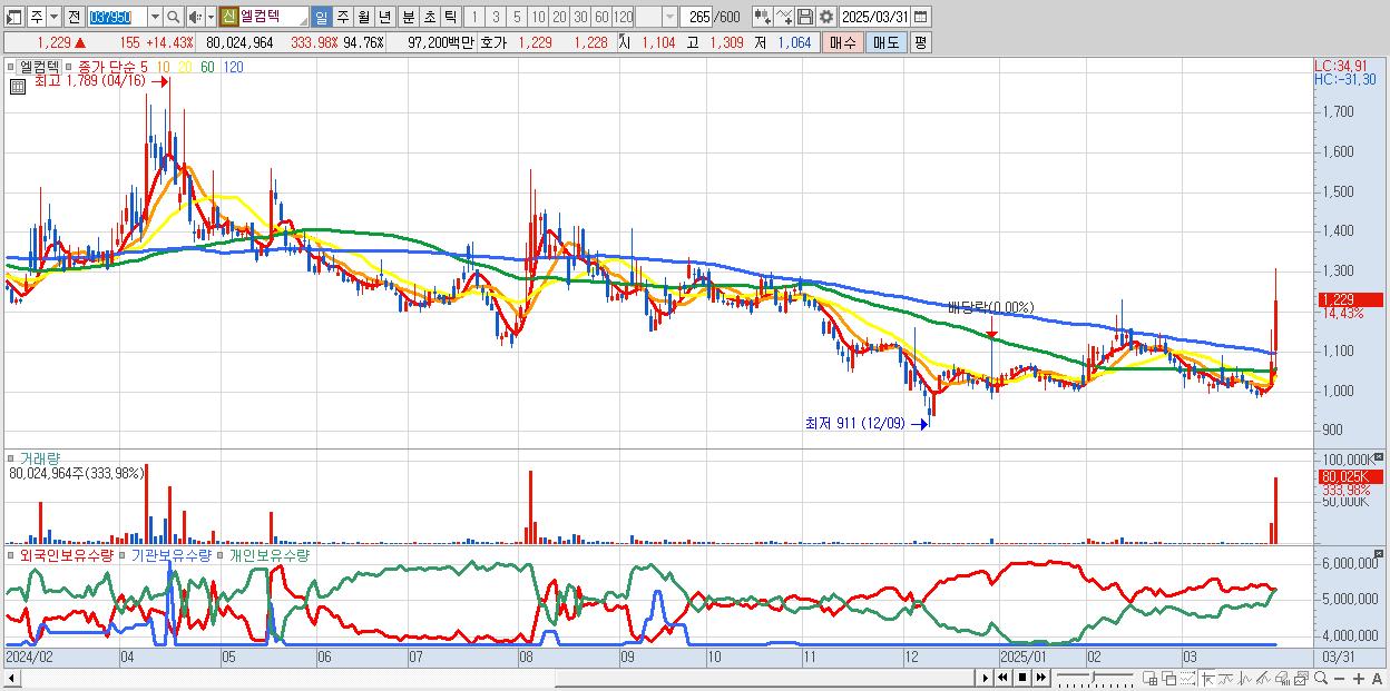 - 엘컴텍 (1,229원 ▲ 14.43% , 시총: 1,038억, 거래량: 80,024,964, 거래대금:972억)