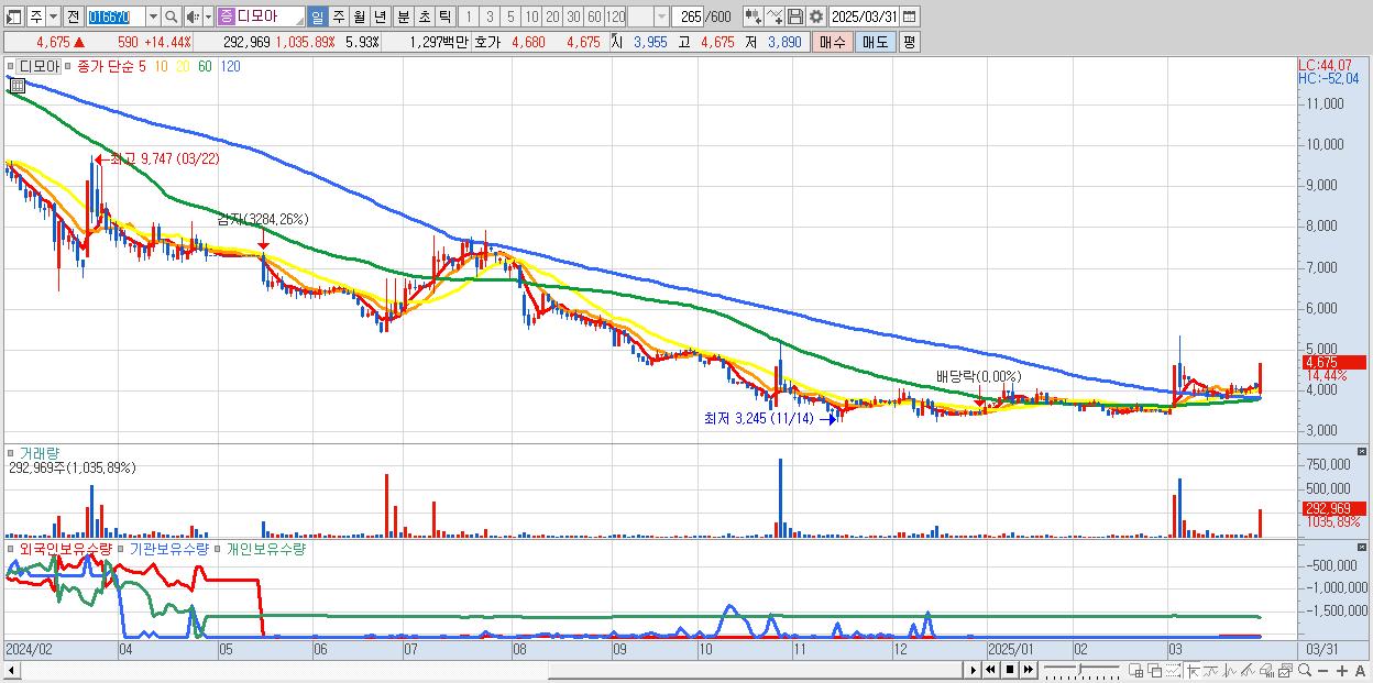 - 디모아 (4,675원 ▲ 14.44% , 시총: 231억, 거래량: 292,969, 거래대금:13억)