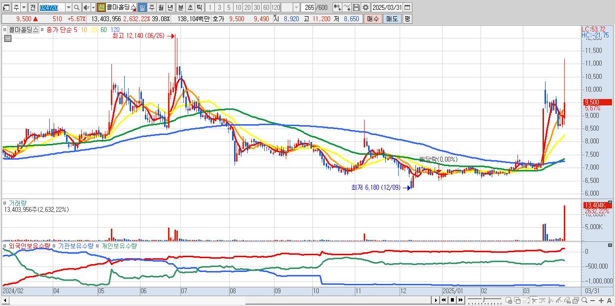 - 콜마홀딩스 (9,720원 ▲ 8.12% , 시총: 3,334억, 거래량: 9,071,696, 거래대금:936억)