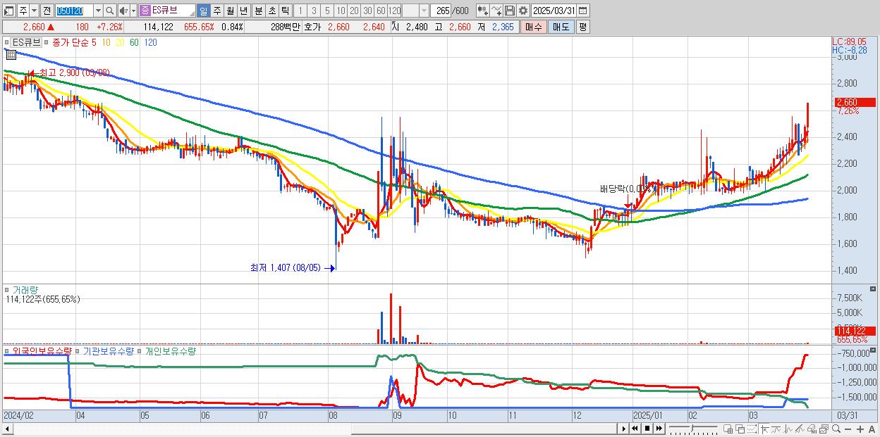 - ES큐브 (2,660원 ▲ 7.26% , 시총: 361억, 거래량: 114,122, 거래대금:3억)