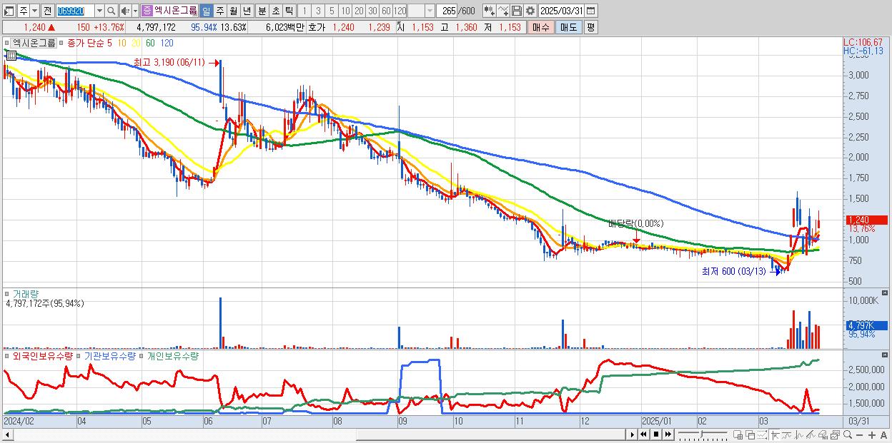 - 엑시온그룹 (1,240원 ▲ 13.76% , 시총: 436억, 거래량: 4,797,172, 거래대금:60억)