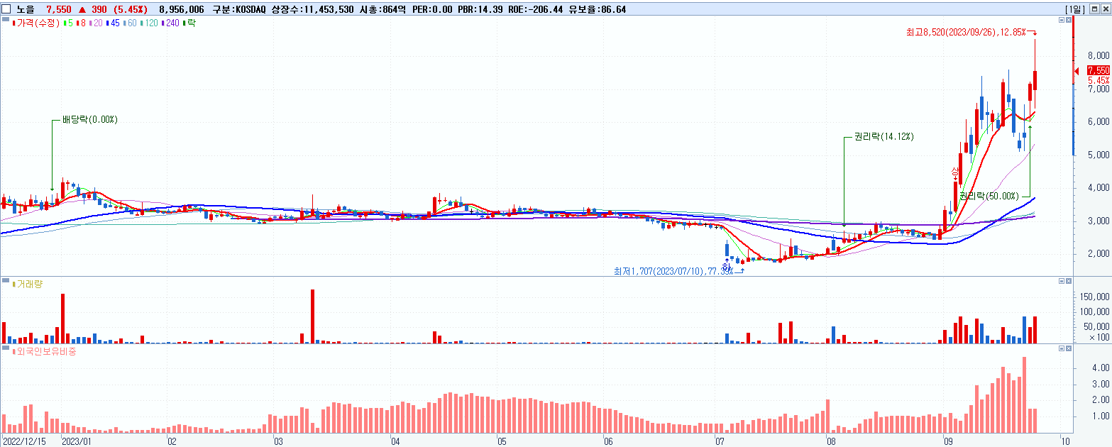 - 노을 (7,550원 ▲ 5.45% , 시총: 865억, 거래량: 8,956,006, 거래대금:691억)