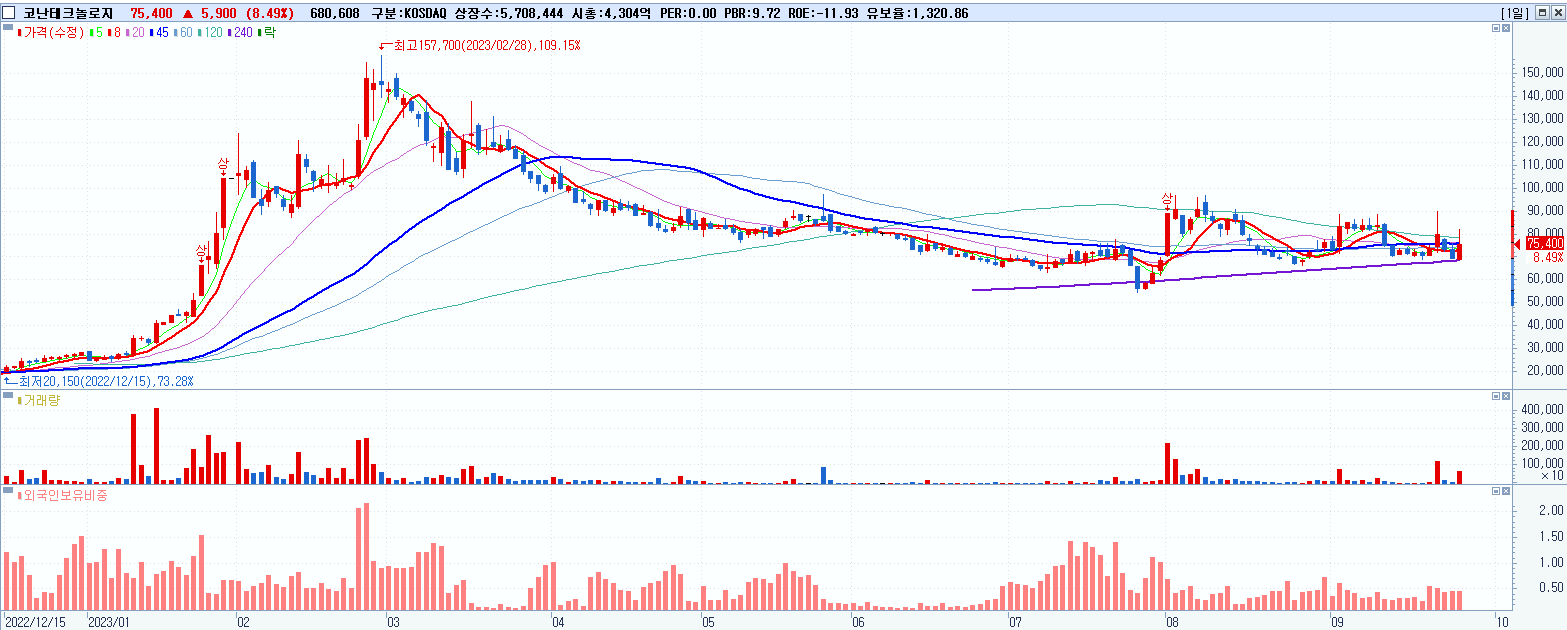 - 코난테크놀로지 (75,400원 ▲ 8.49% , 시총: 4,304억, 거래량: 680,608, 거래대금:523억)