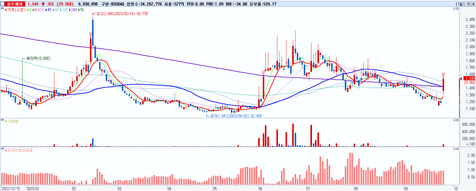 2.솔트웨어 1,540원 ▲ 29.96% (KOSDAQ, 328380)