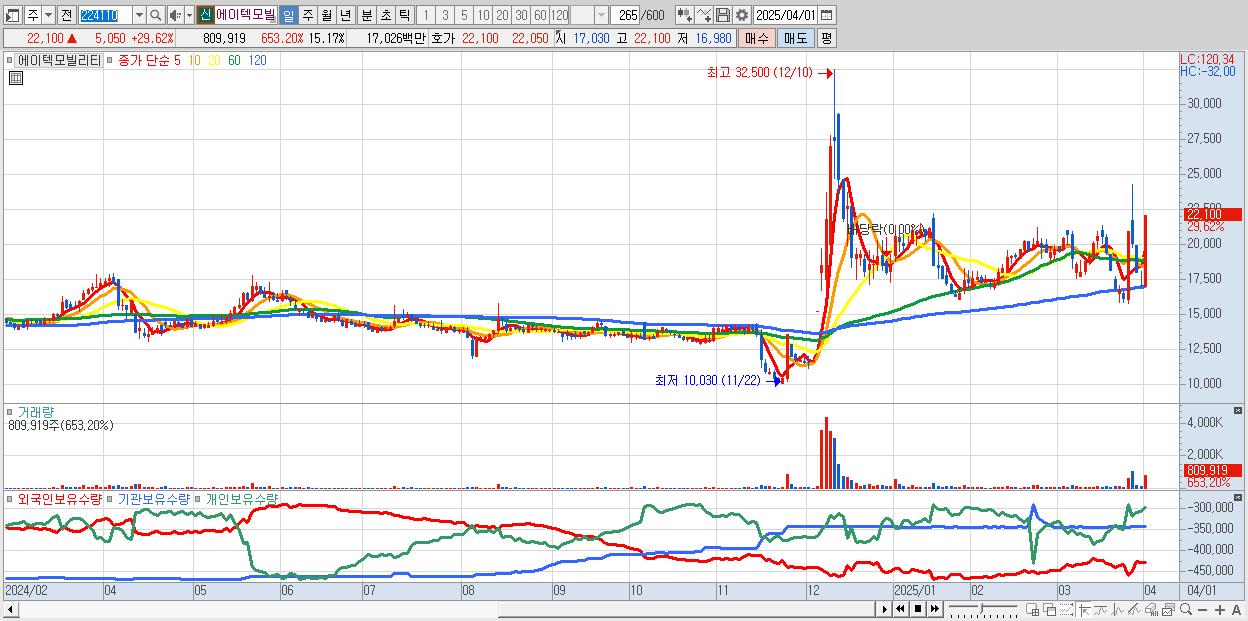 - 에이텍모빌리티 (22,100원 ▲ 29.62% , 시총: 1,180억, 거래량: 809,919, 거래대금:170억)