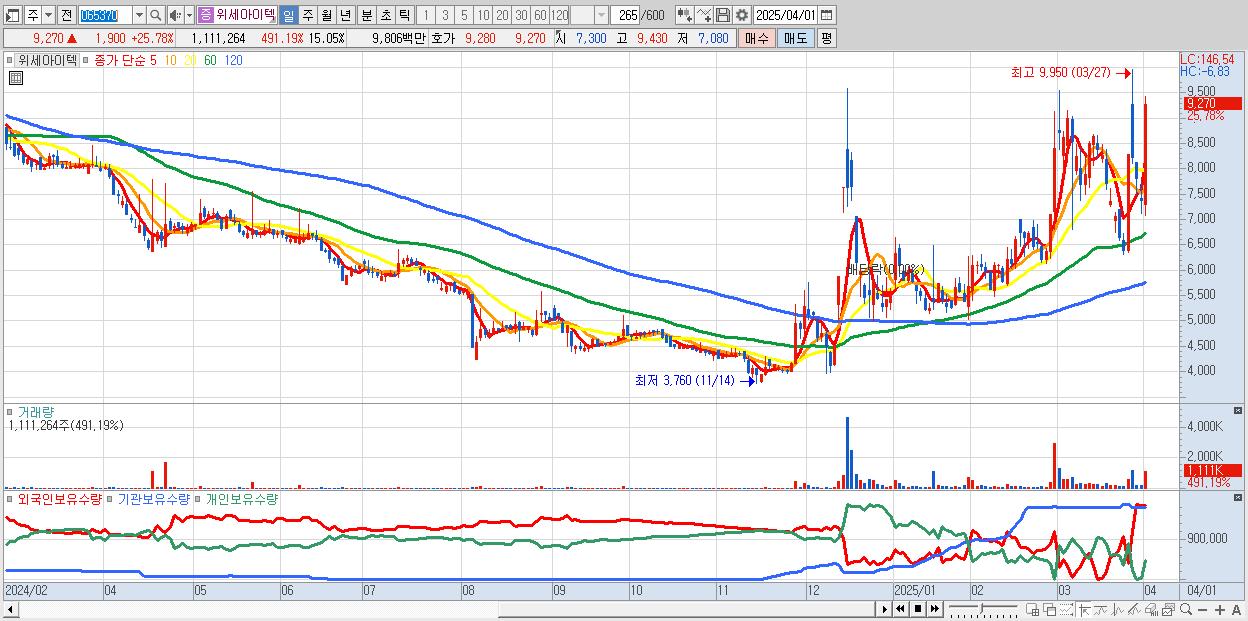 - 위세아이텍 (9,270원 ▲ 25.78% , 시총: 684억, 거래량: 1,111,264, 거래대금:98억)