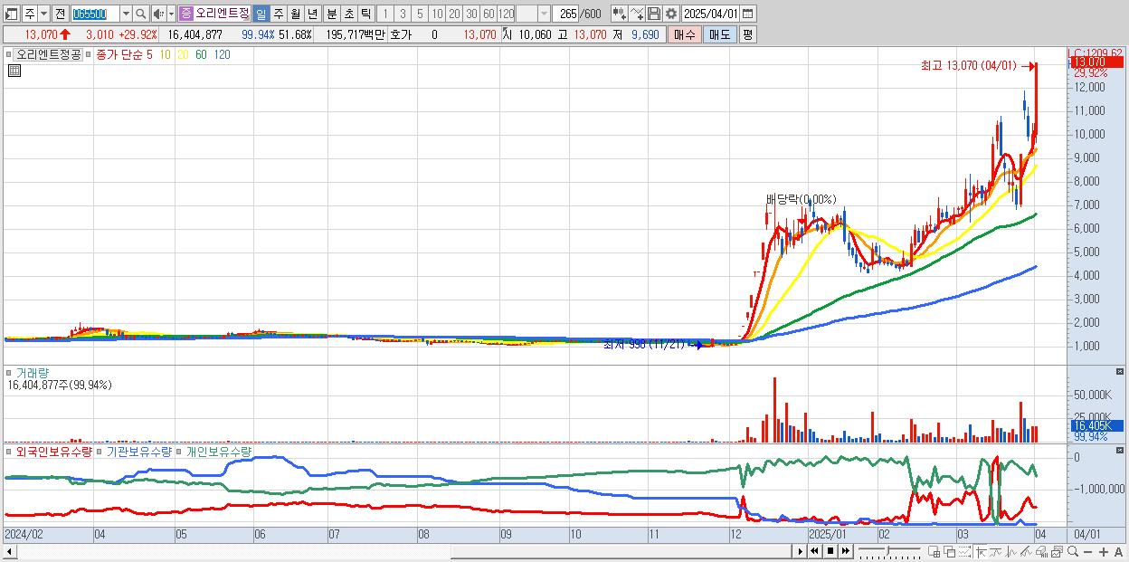 - 오리엔트정공 (13,070원 ▲ 29.92% , 시총: 4,149억, 거래량: 16,404,877, 거래대금:1,957억)
