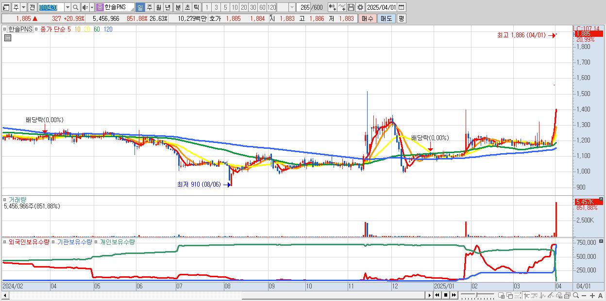- 한솔PNS (1,885원 ▲ 20.99% , 시총: 386억, 거래량: 5,456,966, 거래대금:103억)