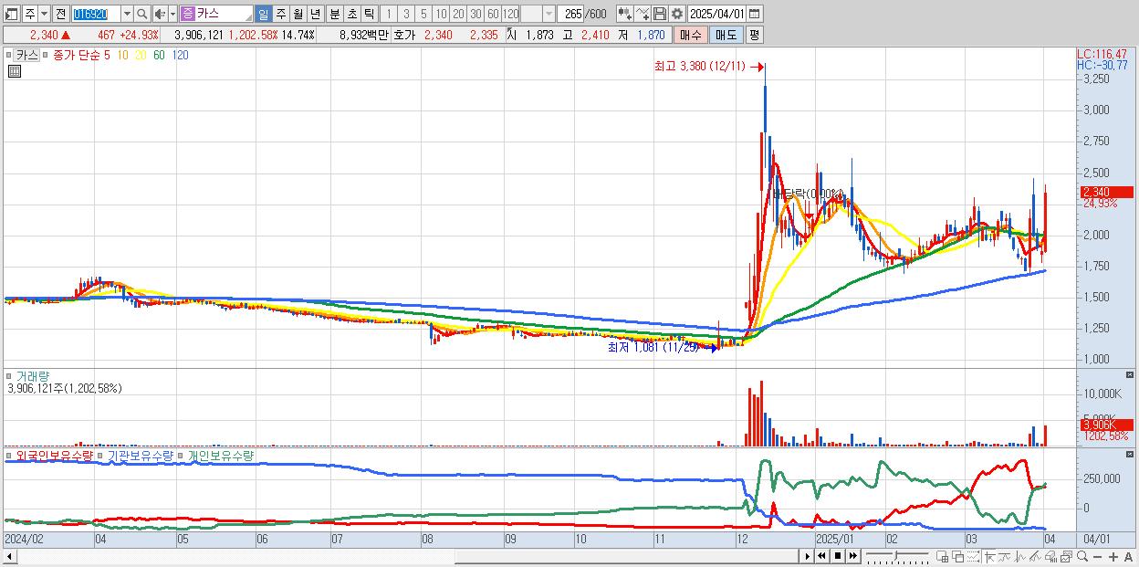 - 카스 (2,340원 ▲ 24.93% , 시총: 620억, 거래량: 3,906,121, 거래대금:89억)