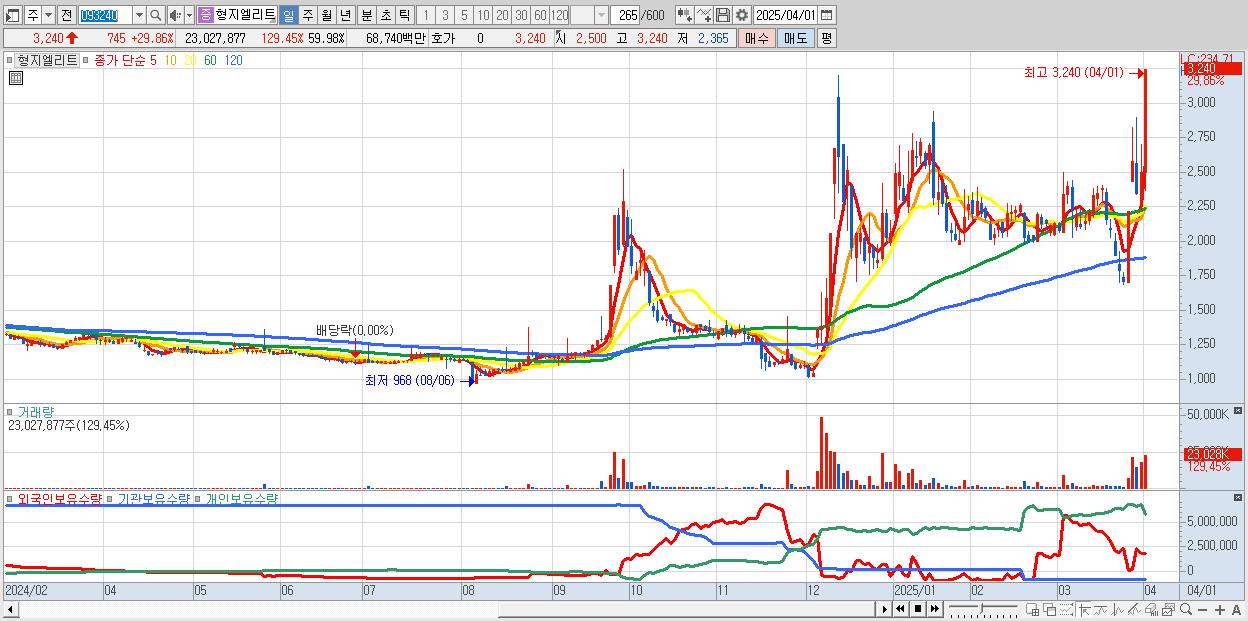 - 형지엘리트 (3,240원 ▲ 29.86% , 시총: 1,244억, 거래량: 23,027,877, 거래대금:687억)