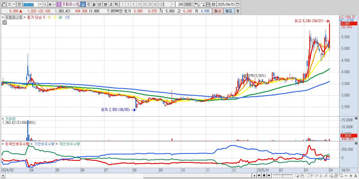 - 프럼파스트 (6,080원 ▲ 20.16% , 시총: 592억, 거래량: 1,360,421, 거래대금:80억)