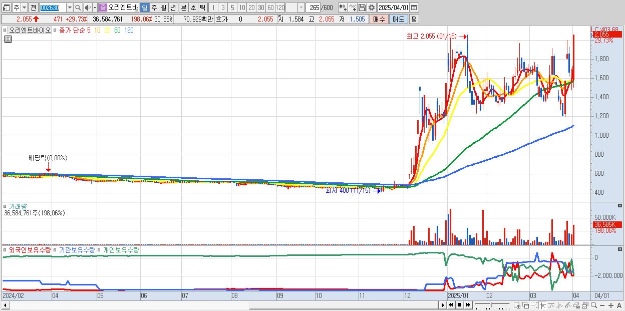 - 오리엔트바이오 (2,055원 ▲ 29.73% , 시총: 2,437억, 거래량: 36,584,761, 거래대금:709억)