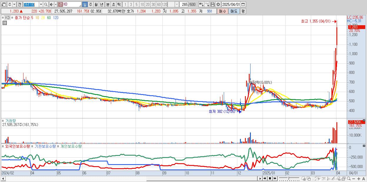 - KD (1,283원 ▲ 20.7% , 시총: 343억, 거래량: 27,505,267, 거래대금:327억)