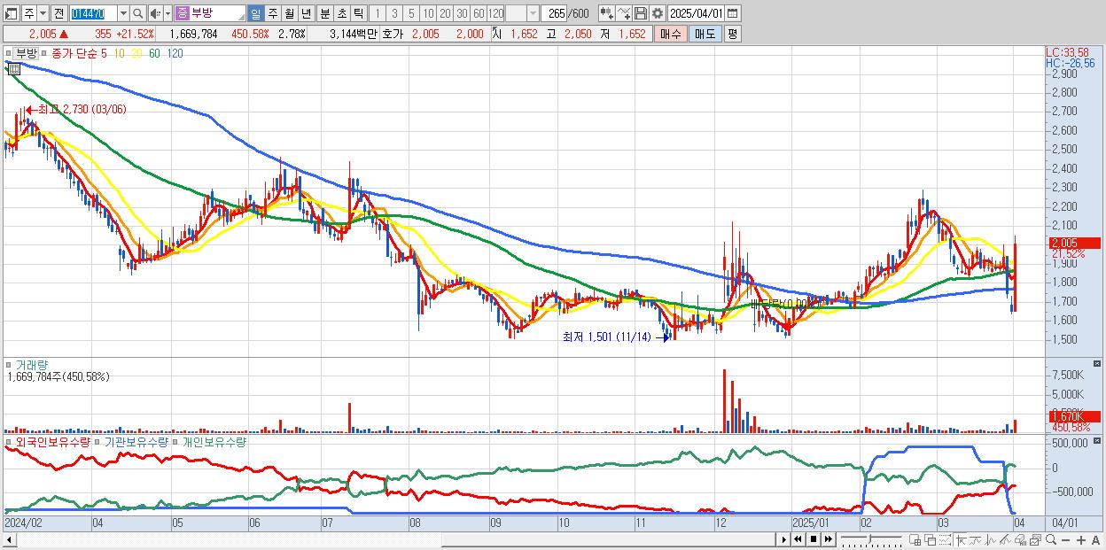 - 부방 (2,005원 ▲ 21.52% , 시총: 1,204억, 거래량: 1,669,784, 거래대금:31억)