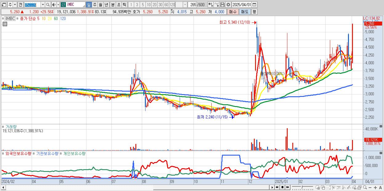 - iMBC (5,260원 ▲ 29.56% , 시총: 1,210억, 거래량: 19,121,036, 거래대금:949억)