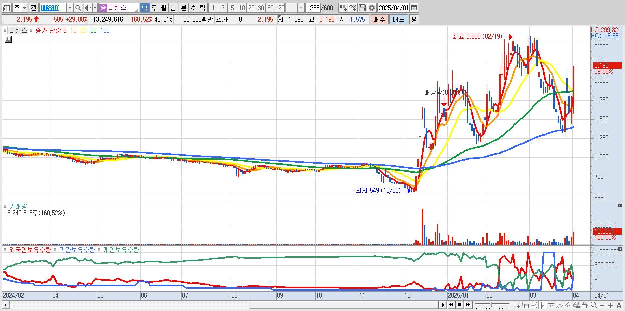 - 디젠스 (2,195원 ▲ 29.88% , 시총: 716억, 거래량: 13,249,616, 거래대금:268억)
