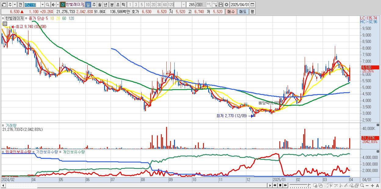 29.한빛레이저 6,530원 ▲ 20.26% (KOSDAQ, 452190)