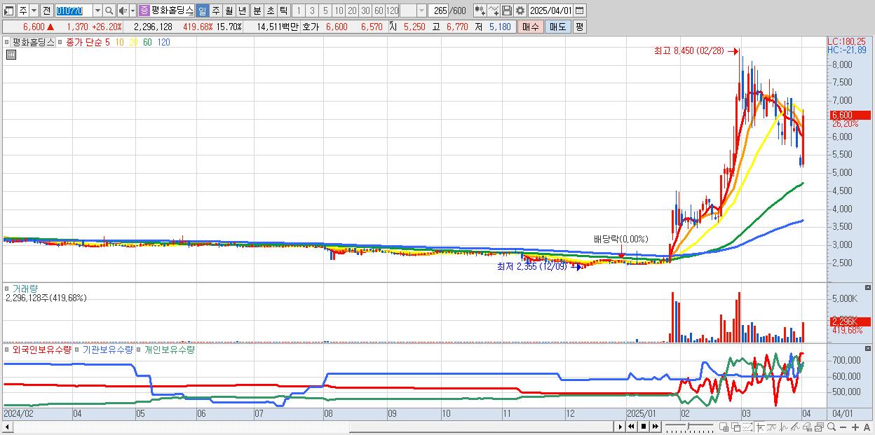 - 평화홀딩스 (6,600원 ▲ 26.2% , 시총: 965억, 거래량: 2,296,128, 거래대금:145억)