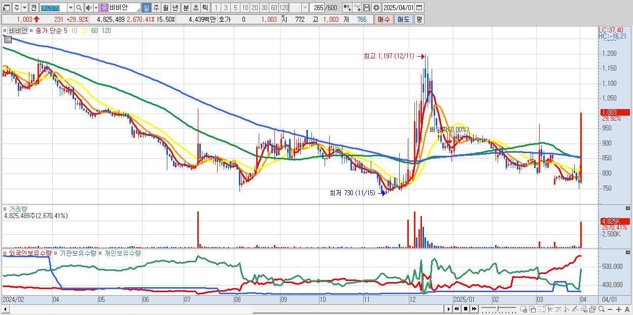 - 비비안 (1,003원 ▲ 29.92% , 시총: 312억, 거래량: 4,825,489, 거래대금:44억)