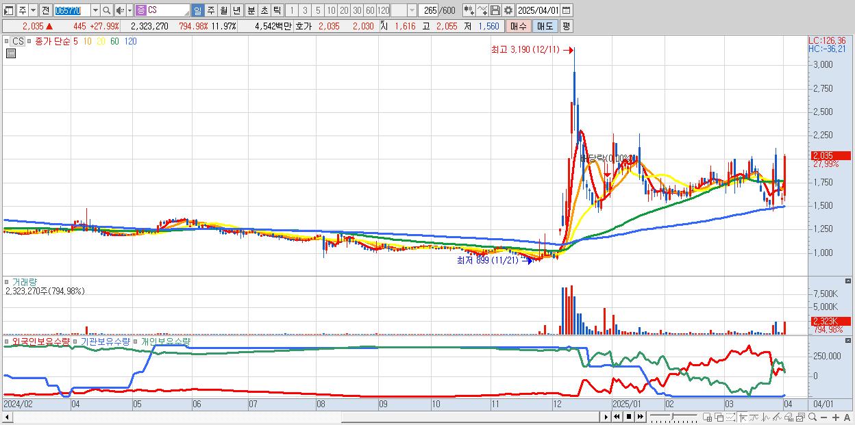 - CS (2,035원 ▲ 27.99% , 시총: 395억, 거래량: 2,323,270, 거래대금:45억)