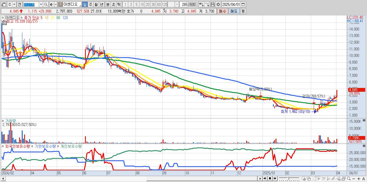 - 아센디오 (4,845원 ▲ 29.89% , 시총: 502억, 거래량: 2,797,803, 거래대금:130억)
