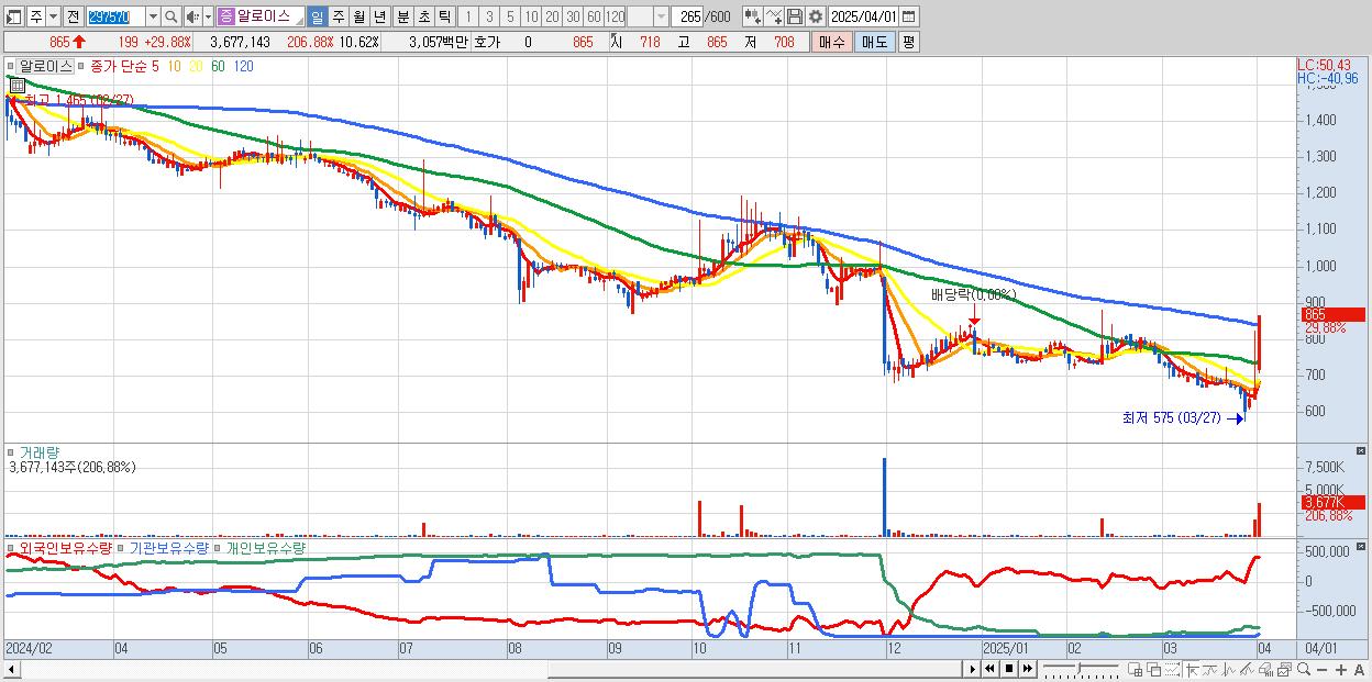 - 알로이스 (865원 ▲ 29.88% , 시총: 299억, 거래량: 3,677,143, 거래대금:31억)