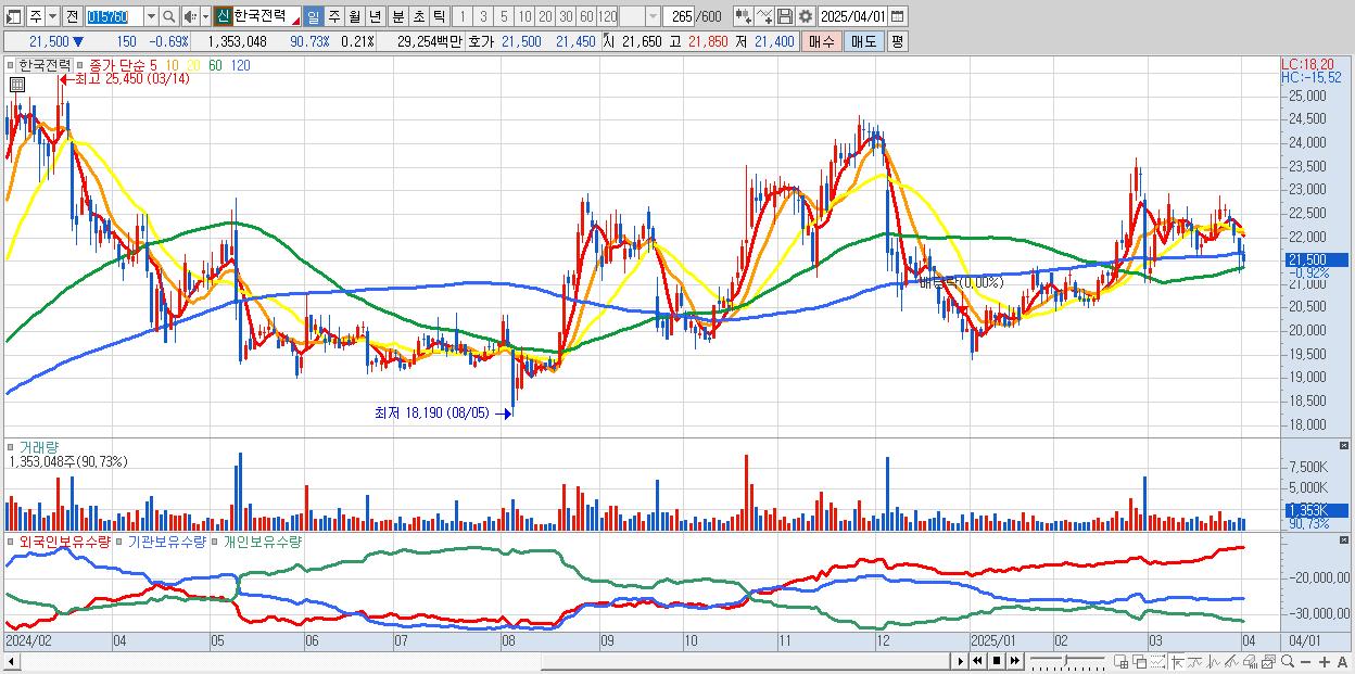 - 한국전력 (21,450원 ▼ -0.92% , 시총: 137,701억, 외국인 순매수 거래금:40억)