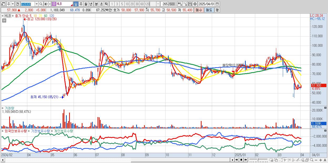 - HLB (58,000원 ▲ 5.26% , 시총: 76,227억, 외국인 순매수 거래금:97억)