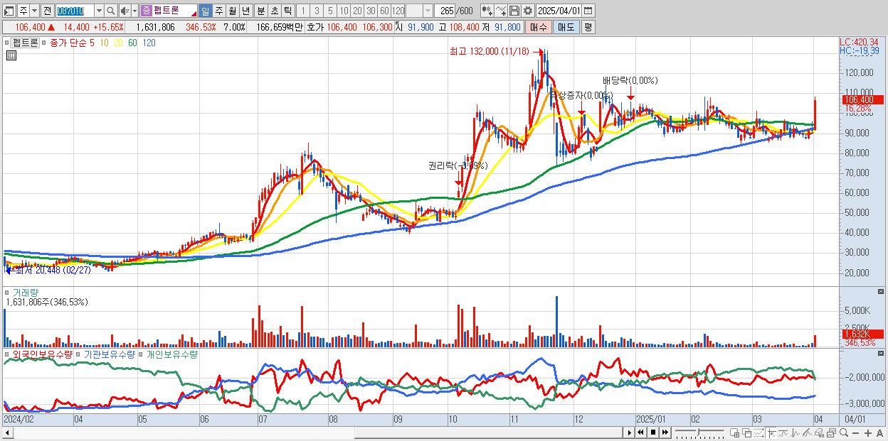 - 펩트론 (106,500원 ▲ 15.76% , 시총: 24,812억, 외국인 순매수 거래금:293억)