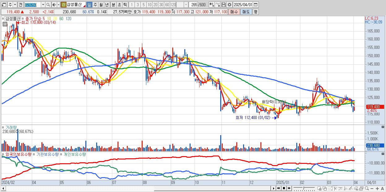 - 삼성물산 (119,200원 ▲ 1.97% , 시총: 202,612억, 외국인 순매수 거래금:101억)