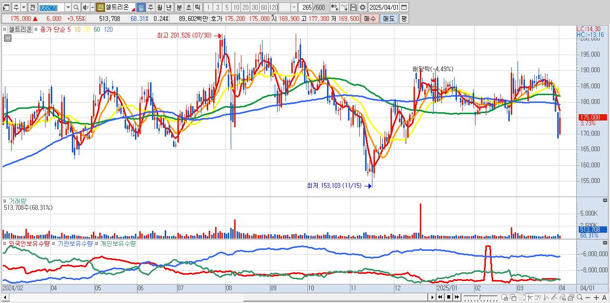 - 셀트리온 (174,800원 ▲ 3.43% , 시총: 374,261억, 외국인 순매수 거래금:45억)
