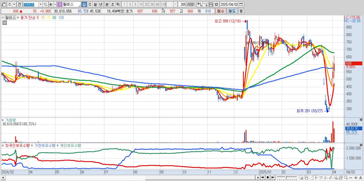 - 윌비스 (606원 ▲ 9.98% , 시총: 407억, 거래량: 30,610,656, 거래대금:185억)