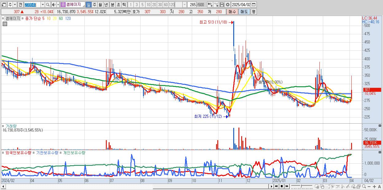 - 썸에이지 (307원 ▲ 10.04% , 시총: 427억, 거래량: 16,730,870, 거래대금:53억)