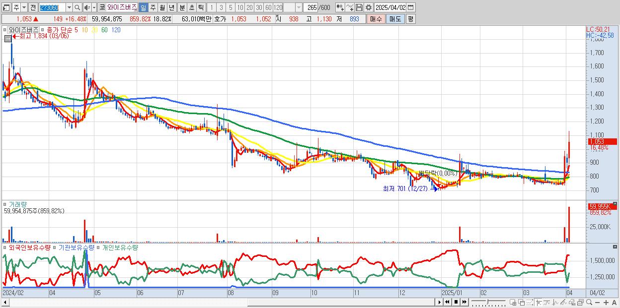 - 와이즈버즈 (1,053원 ▲ 16.48% , 시총: 531억, 거래량: 59,954,875, 거래대금:630억)