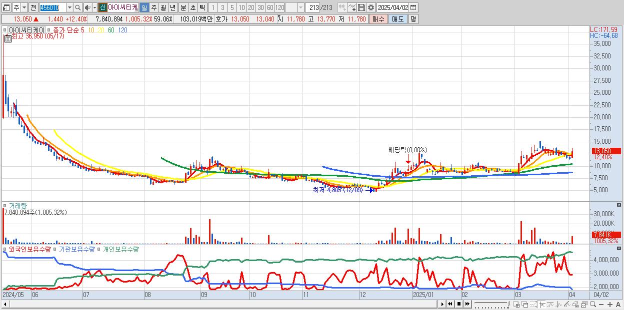- 아이씨티케이 (13,050원 ▲ 12.4% , 시총: 1,733억, 거래량: 7,840,894, 거래대금:1,030억)