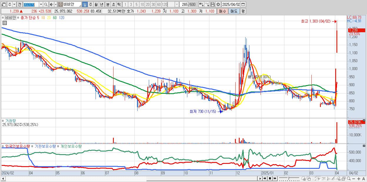 - 비비안 (1,239원 ▲ 23.53% , 시총: 386억, 거래량: 25,973,062, 거래대금:325억)