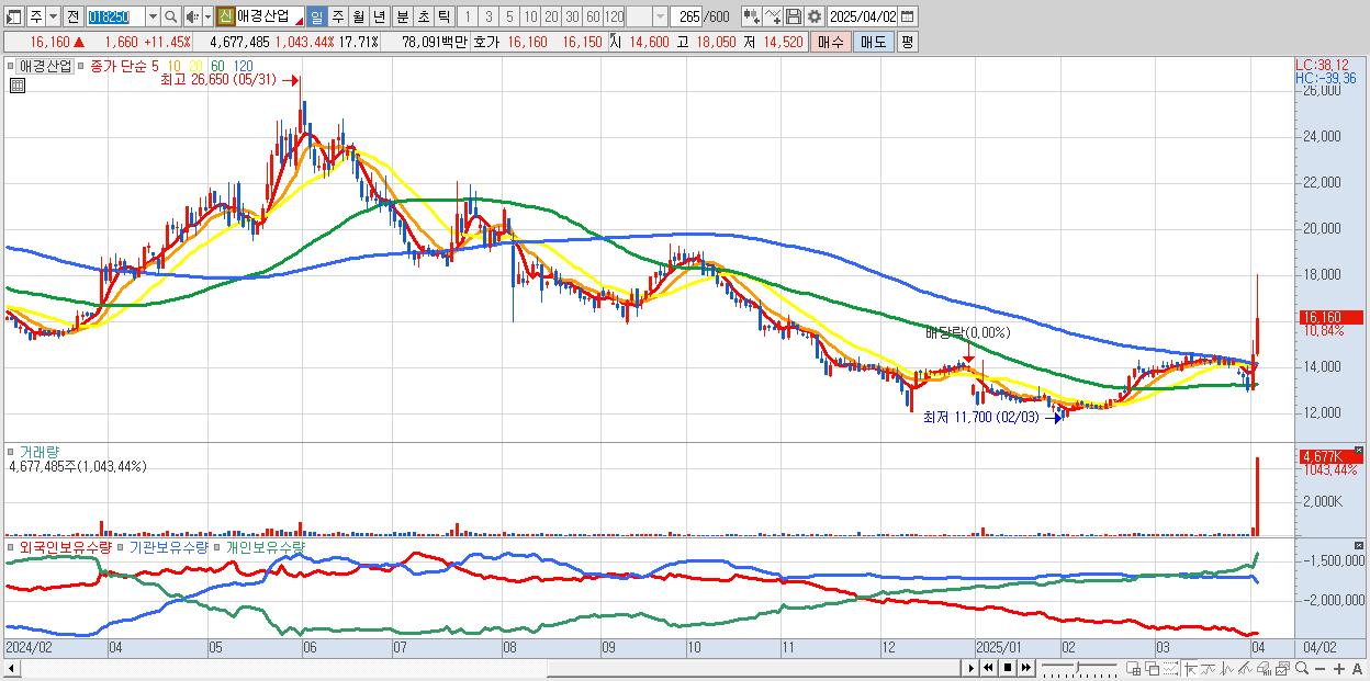 - 애경산업 (16,120원 ▲ 11.17% , 시총: 4,257억, 거래량: 3,065,312, 거래대금:513억)