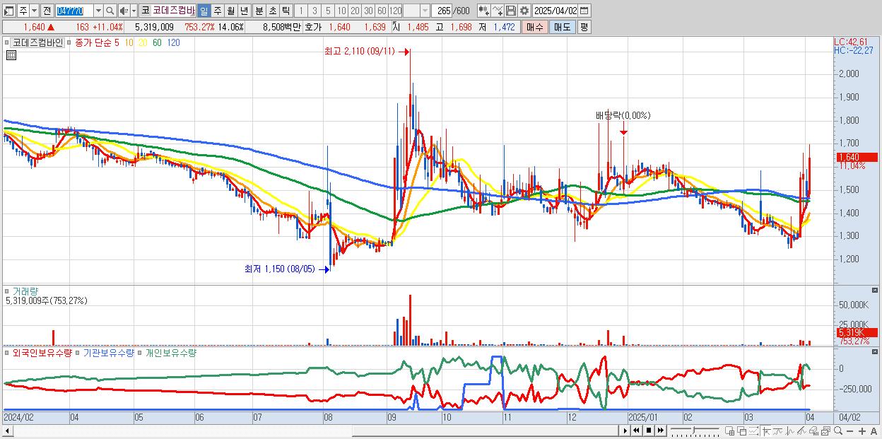- 코데즈컴바인 (1,640원 ▲ 11.04% , 시총: 621억, 거래량: 5,319,009, 거래대금:85억)