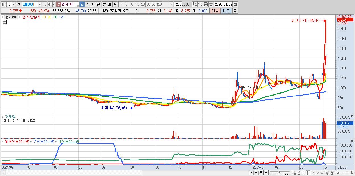 - 형지I&C (2,735원 ▲ 29.93% , 시총: 863억, 거래량: 53,882,264, 거래대금:1,300억)