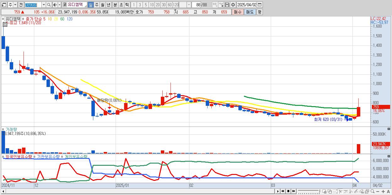 - 유디엠텍 (759원 ▲ 16.06% , 시총: 304억, 거래량: 23,947,199, 거래대금:191억)