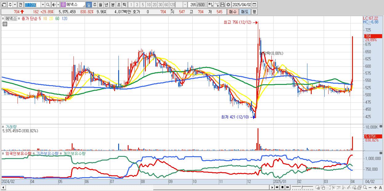 - 에넥스 (704원 ▲ 29.89% , 시총: 422억, 거래량: 5,975,459, 거래대금:40억)