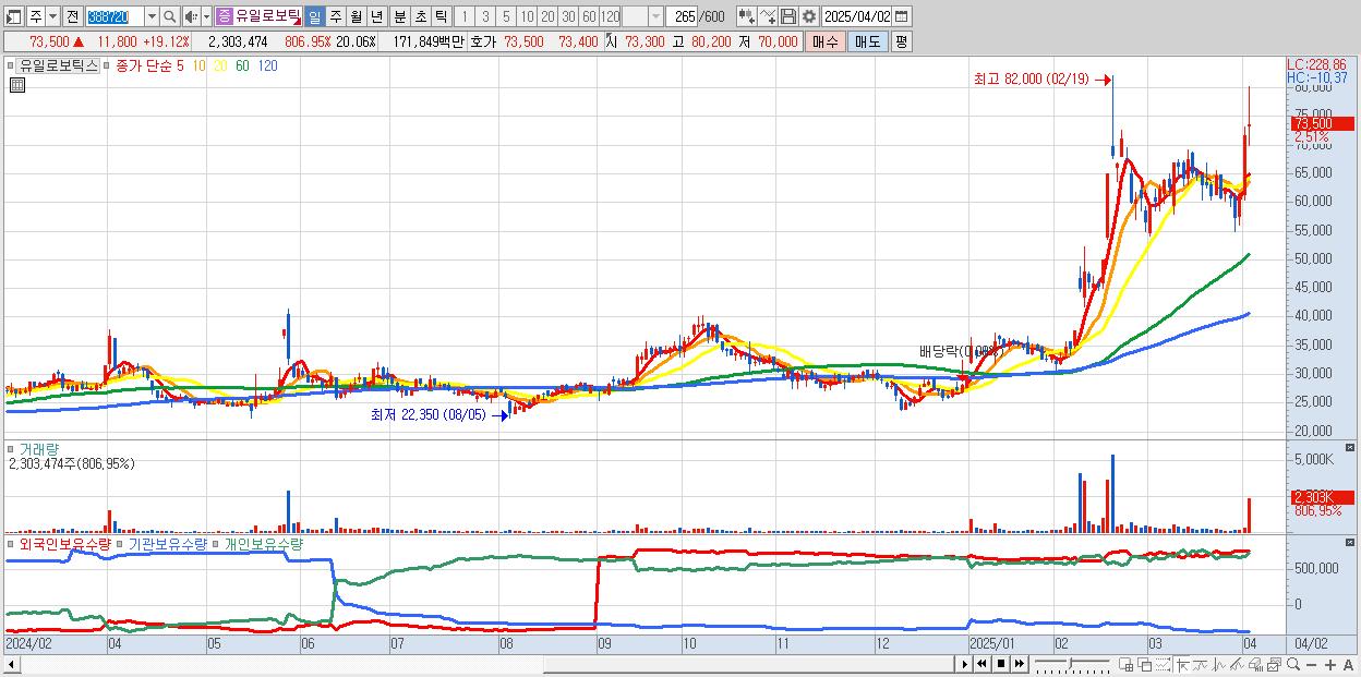 - 유일로보틱스 (72,300원 ▲ 17.18% , 시총: 8,302억, 거래량: 1,281,842, 거래대금:952억)